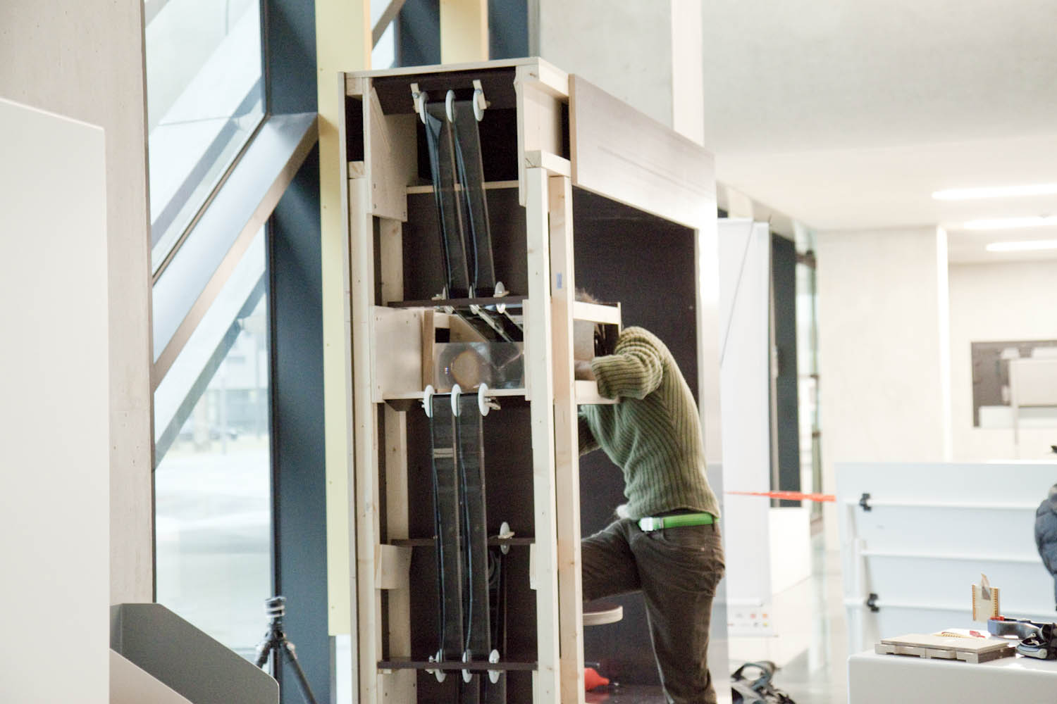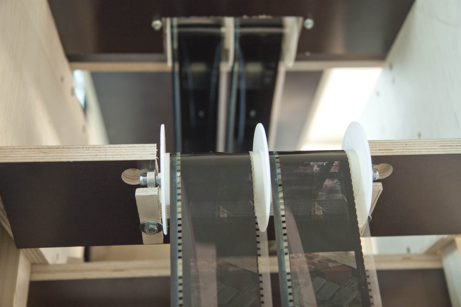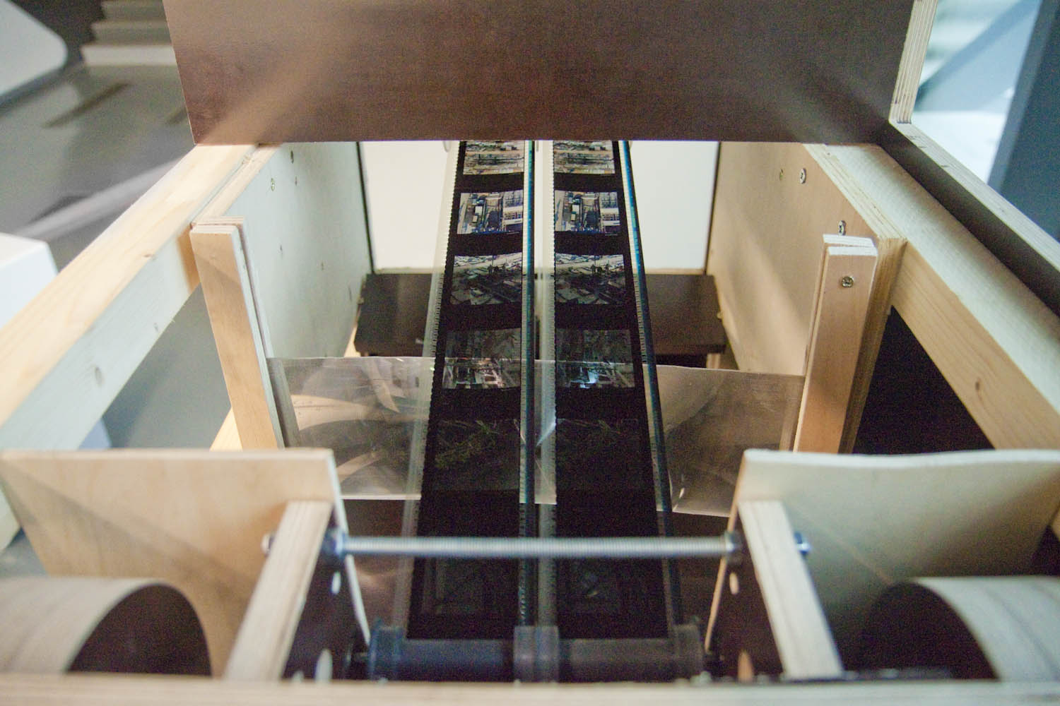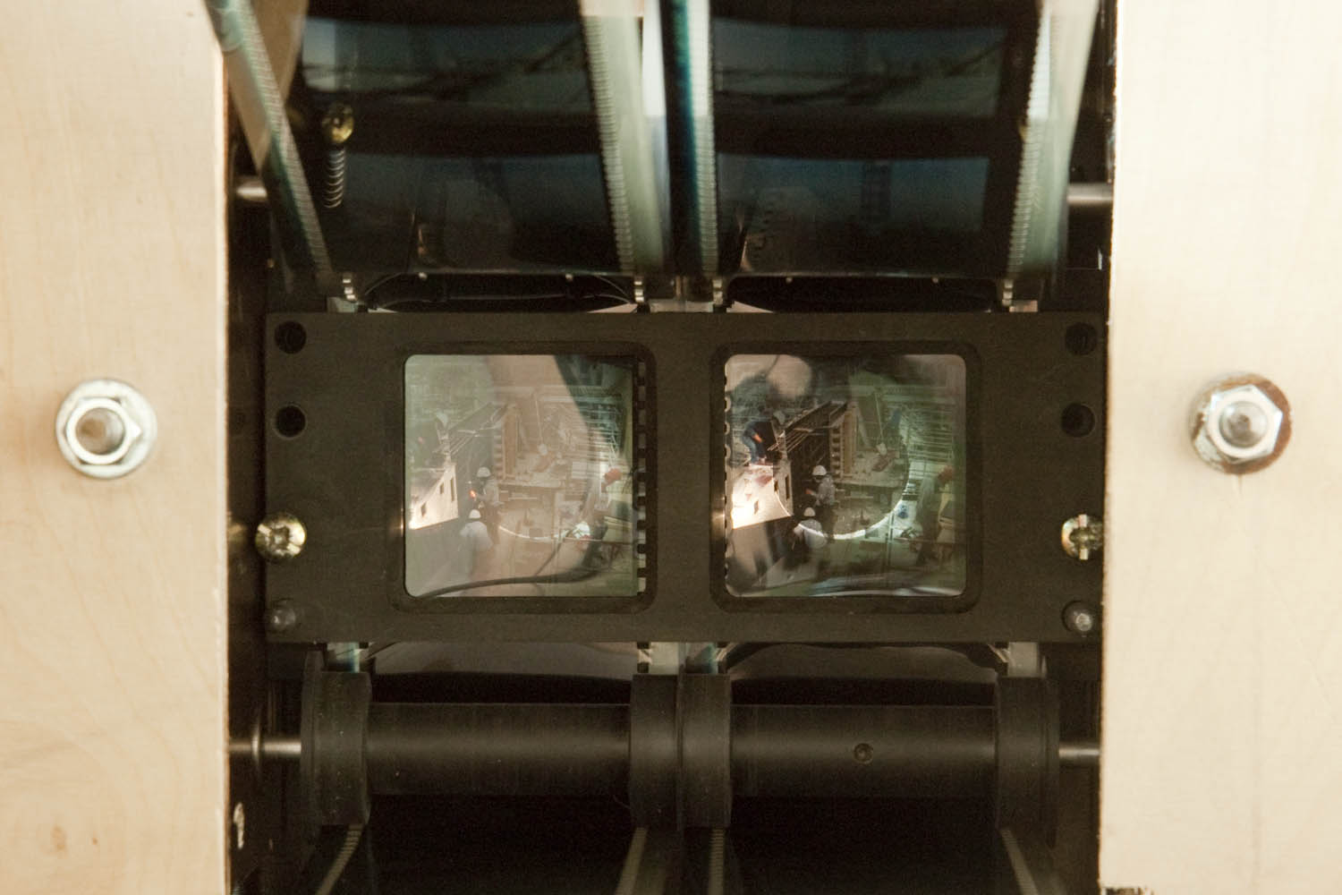 Les images ne sont pas visibles de l’extérieur. Il faut s’asseoir, prendre le temps de laisser son regard s’habituer à la situation binoculaire. Alors seulement les images apparaissent. Elles semblent n’avoir ni support ni dimension : ce sont sont des fenêtres d’archive sur le proche passé environnant : l’histoire de la construction du bâtiment qui abrite l’installation elle-même.
